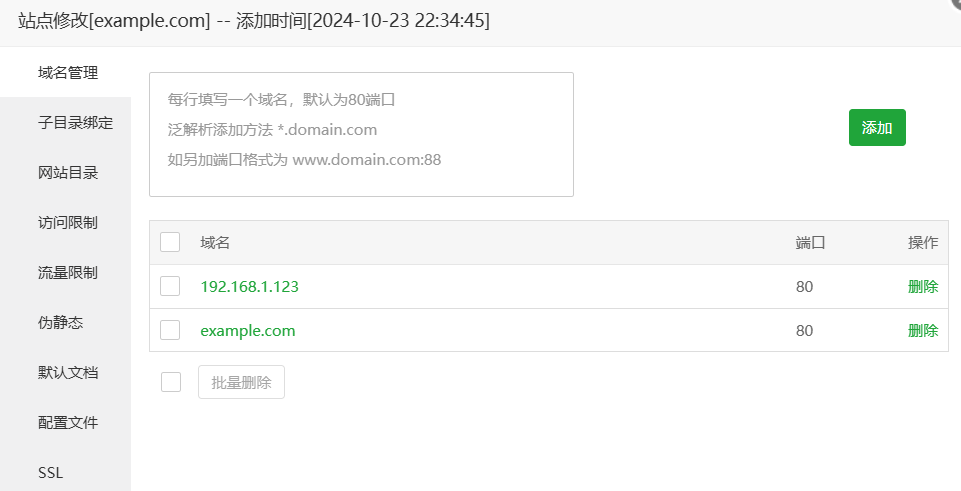 打开 需要配置的网站 的 站点设置,你会看到网站绑定的 域名(IP地址) 和对应的 端口