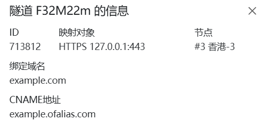 此处可以查看你的 绑定域名 和 节点地址 如下图所示,节点地址 是 example.ofalias.com,绑定域名 是 example.com