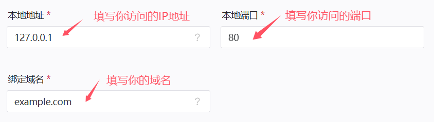 如下图所示,填入你在第一步获取的 IP地址 和 端口,域名 填写你准备绑定的域名