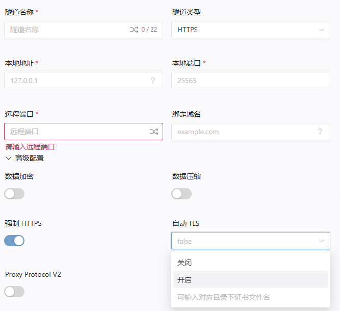 在当前版本中,启用 自动TLS 所用模式将为先前的 auto 模式,隧道会探测本地服务是否为http/s。
