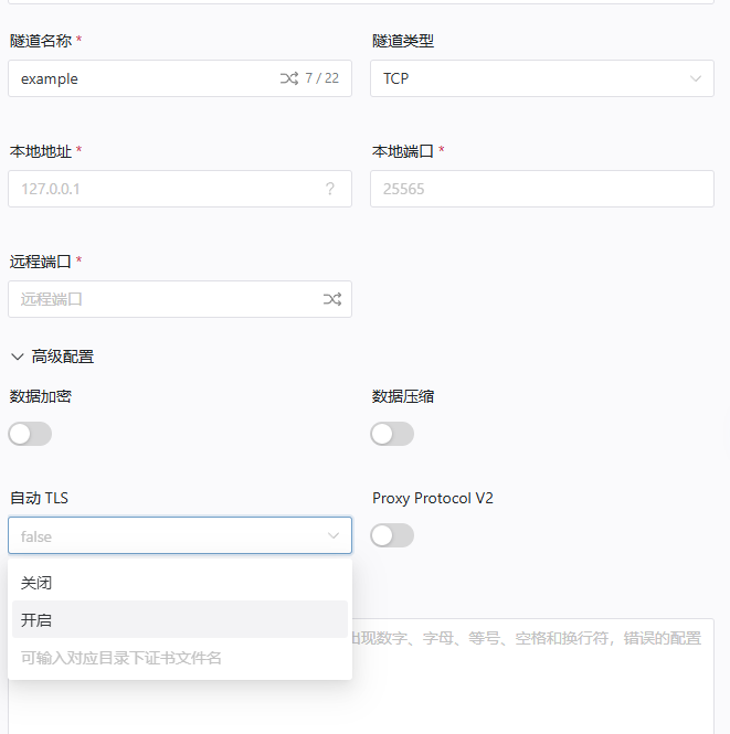 在此选择框内直接输入文件名即可。 会试图访问调试目录下的<上述的文件名>.crt和<上述的文件名>.key两个证书文件。 若文件不存在或解析失败 效果与自动TLS :启用相同。(调试目录可通过在frpc命令行后加上--debug后启动获得。)