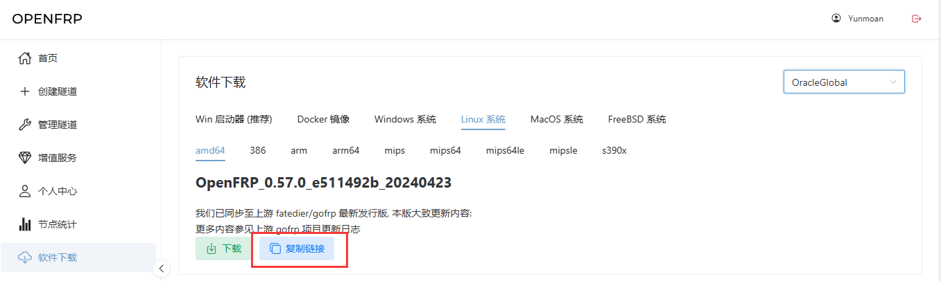 登入管理面板,转到软件下载 在架构一栏找到适合您的Linux版本,点击复制按钮。